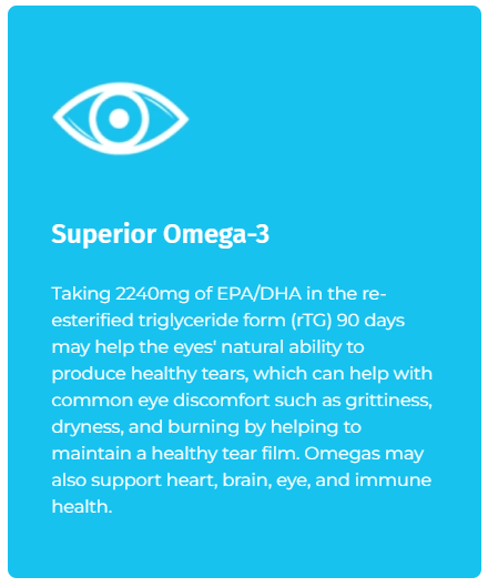 Each serving contains 2240 mg of combined EPA and DHA in a re-esterified triglyceride (rTG) form, which is easier for the body to absorb and supports the tear film’s lipid layer.