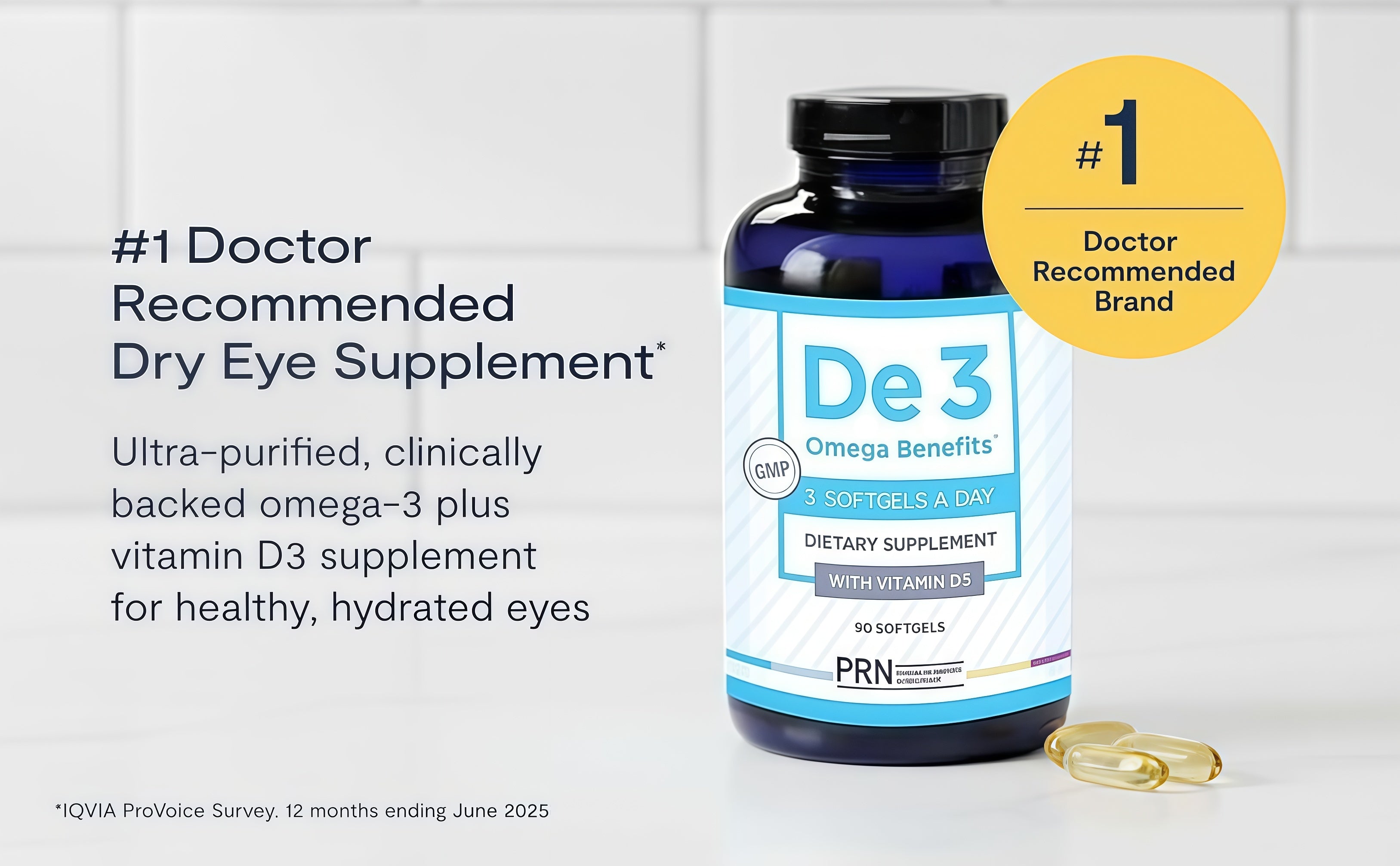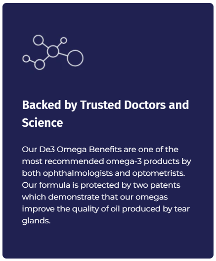 De3 Omega Benefits is an omega-3 supplement formulated to support healthy tear production and relieve occasional eye dryness.